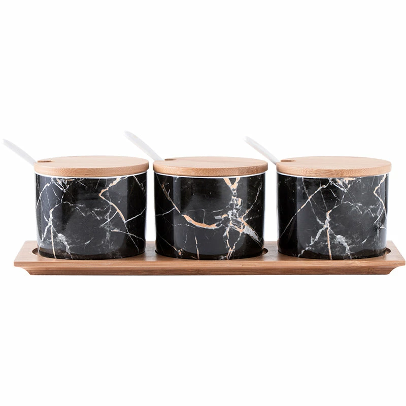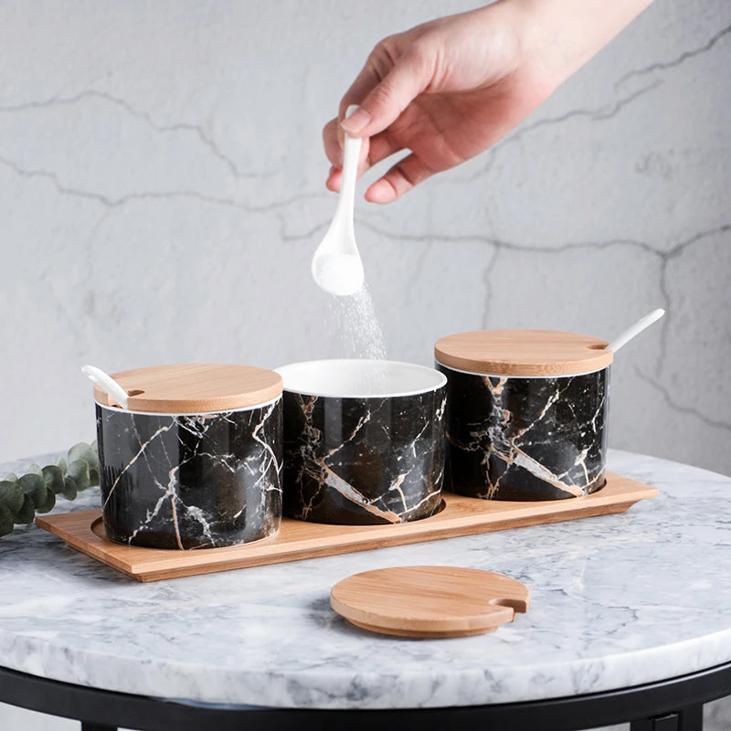 - Materials: Ceramic with marble pattern / bamboo tray and lid