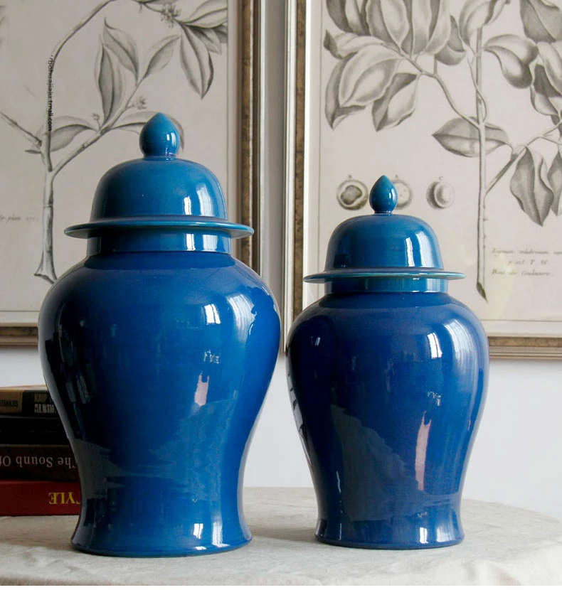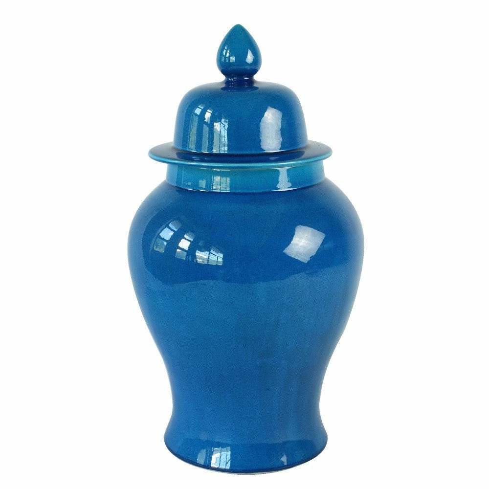 A vibrant peacock blue creates a beautiful modern take on a traditional chinese urn. Great for adding some oriental flair and a burst of colour to living spaces. Beautiful as a decorative item or lid-off as a stuning vase.