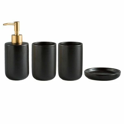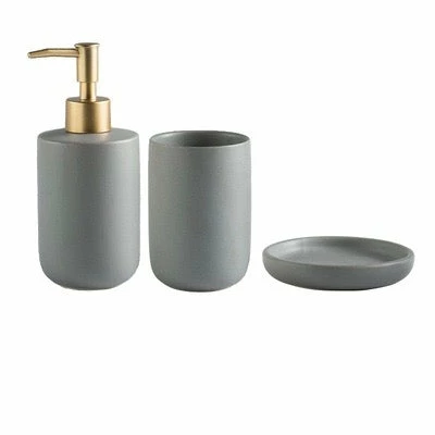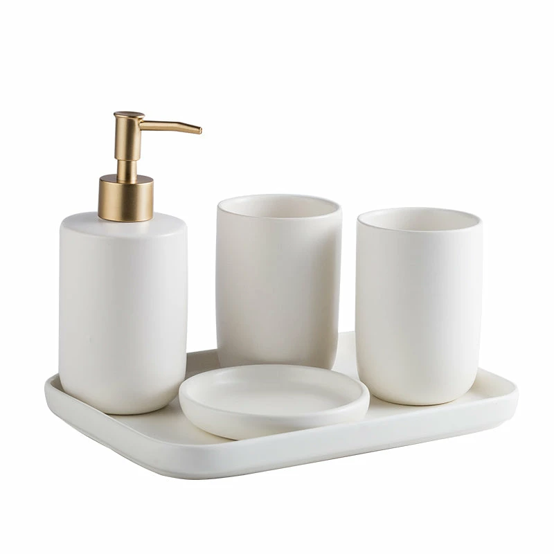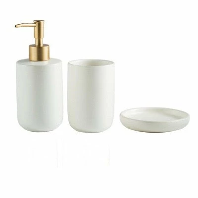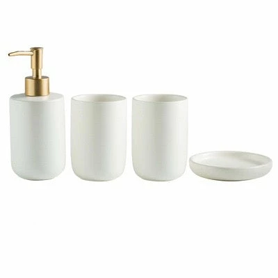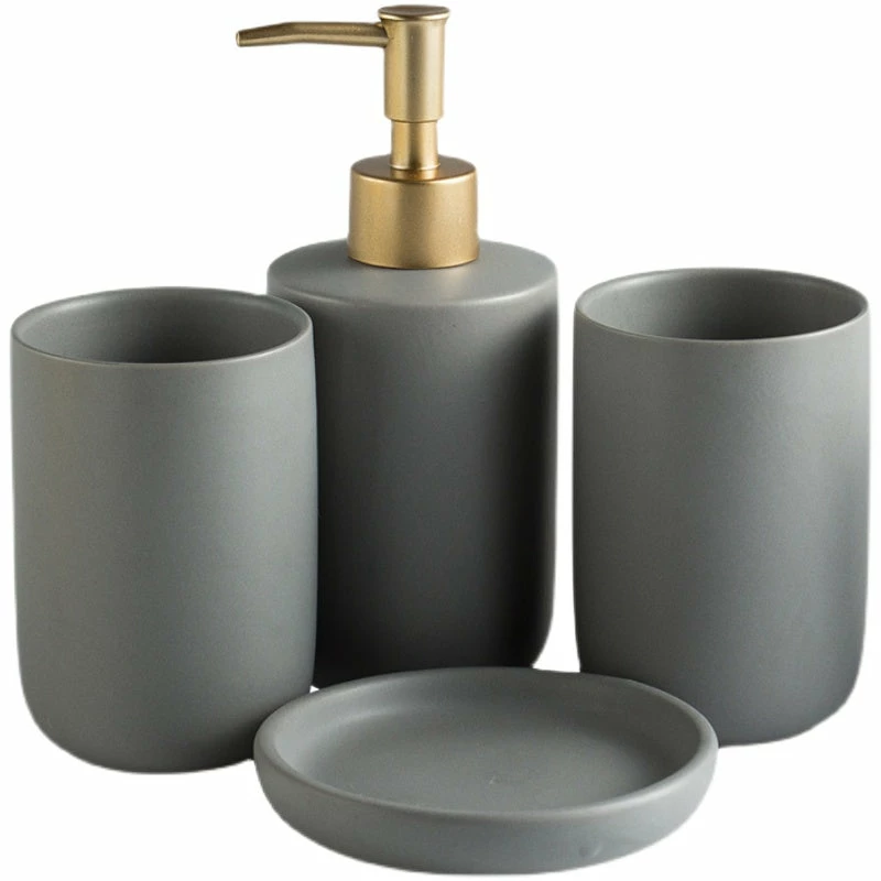 This Classic Modern Bathroom Accessory Set might just be the key to keeping your bathroom neat and clean. Made from ceramic with a smooth and simple finish, this set of cups, a round dish, and a soap dispenser can free up space on your vanity counter. Those unsightly product bottles of varying colors, prints, and heights will finally have to go. Decant just what you need onto these vessels and instantly clear off your counter. Decluttering your bathroom is quick and easy with this minimalist bathroom accessory set.