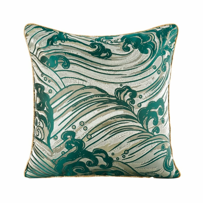 Oh wow! This Emerald Japanese Wave Throw Cushion may look traditional at first but look closely and see its contemporary update. Crafted from quality Jacquard Satin and embellished with golden trim, this printed cushion cover in emerald green color scheme is not to be missed. We like how it exudes a modern, playful, elegant and romantic vibe all at the same time. Get this decorative pillow today and see it bring a unique sense of style to your living space.