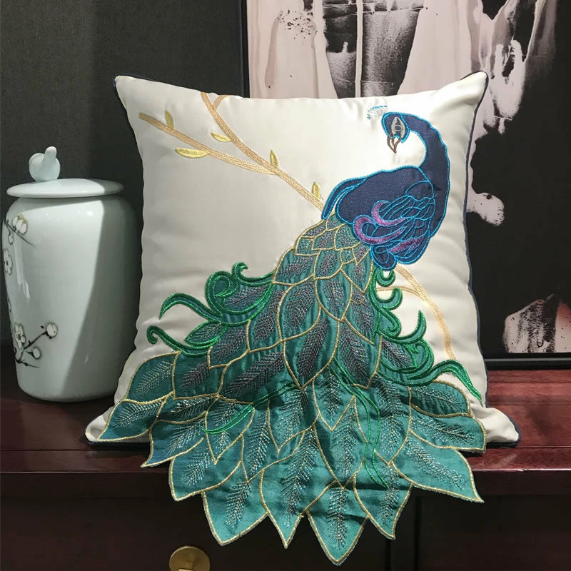 Brighten a neutral sofa with the presence of this Satin Embroidered Peacock Throw Cushion. It features an embroidered peacock print with a tail overhang. The design is both whimsical and elegant which is perfect when you want to keep your interior aesthetics warm and playful. With this throw pillow cover, you can add visual interest and keep your seating area welcoming. To keep the embroidered design perfect, we recommend immediate spot cleaning or handwashing when stains and spills happen.