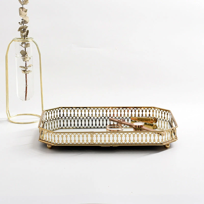 - Materials: Metal with gold finish. Mirrored glass tray.