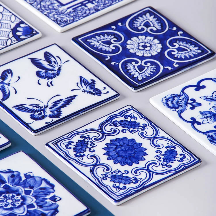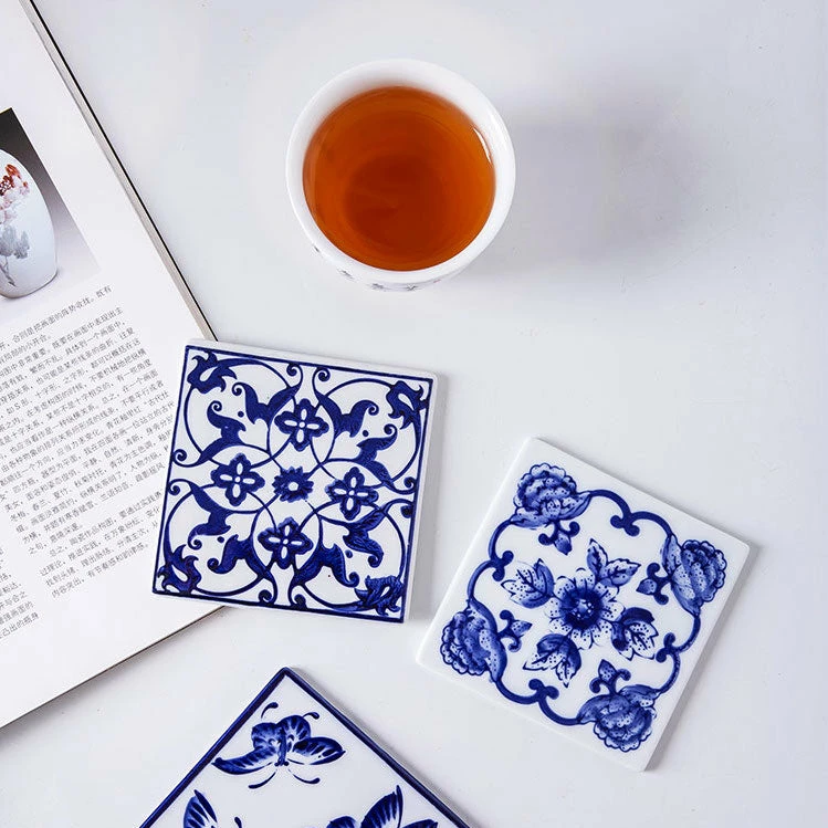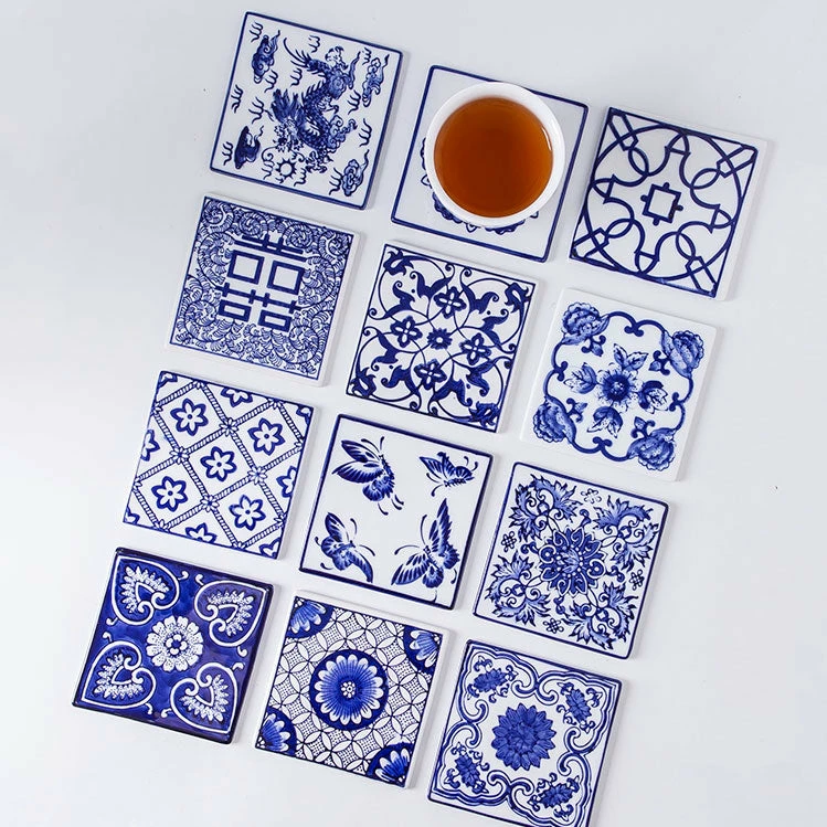 - Includes: Mixed set of 6 different blue and white coasters