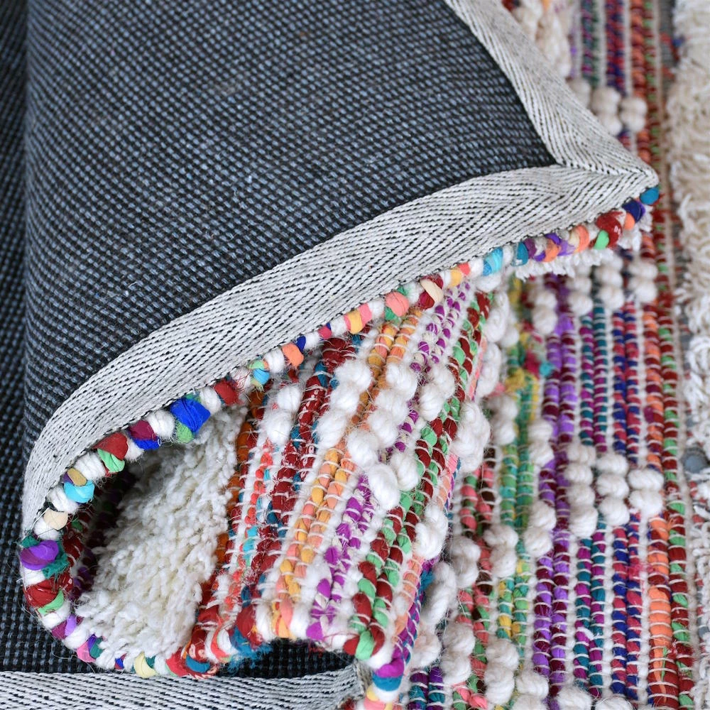 - Care: This rug is handmade from up-cycled fabric. Each piece is unique, and colors and textures may vary slightly. Deep colors may stain light surfaces especially if wet. Use soft hand brush and light vacuum to clean. Avoid using a beater brush. Remove any spills immediately – blot the liquid with a clean cloth or a paper napkin. Do not pull loose ends if any – instead trim with scissors. Keep away from sharp objects, hot surfaces, open fireplaces, and excess moisture. Do not soak the rug in any liquid. For initial weeks, shedding of material fiber may be observed. This is normal and will reduce over time and with use. Colors may fade slightly when placed in areas of direct sunlight, so it is recommended to periodically rotate your rug to ensure the effect is even.