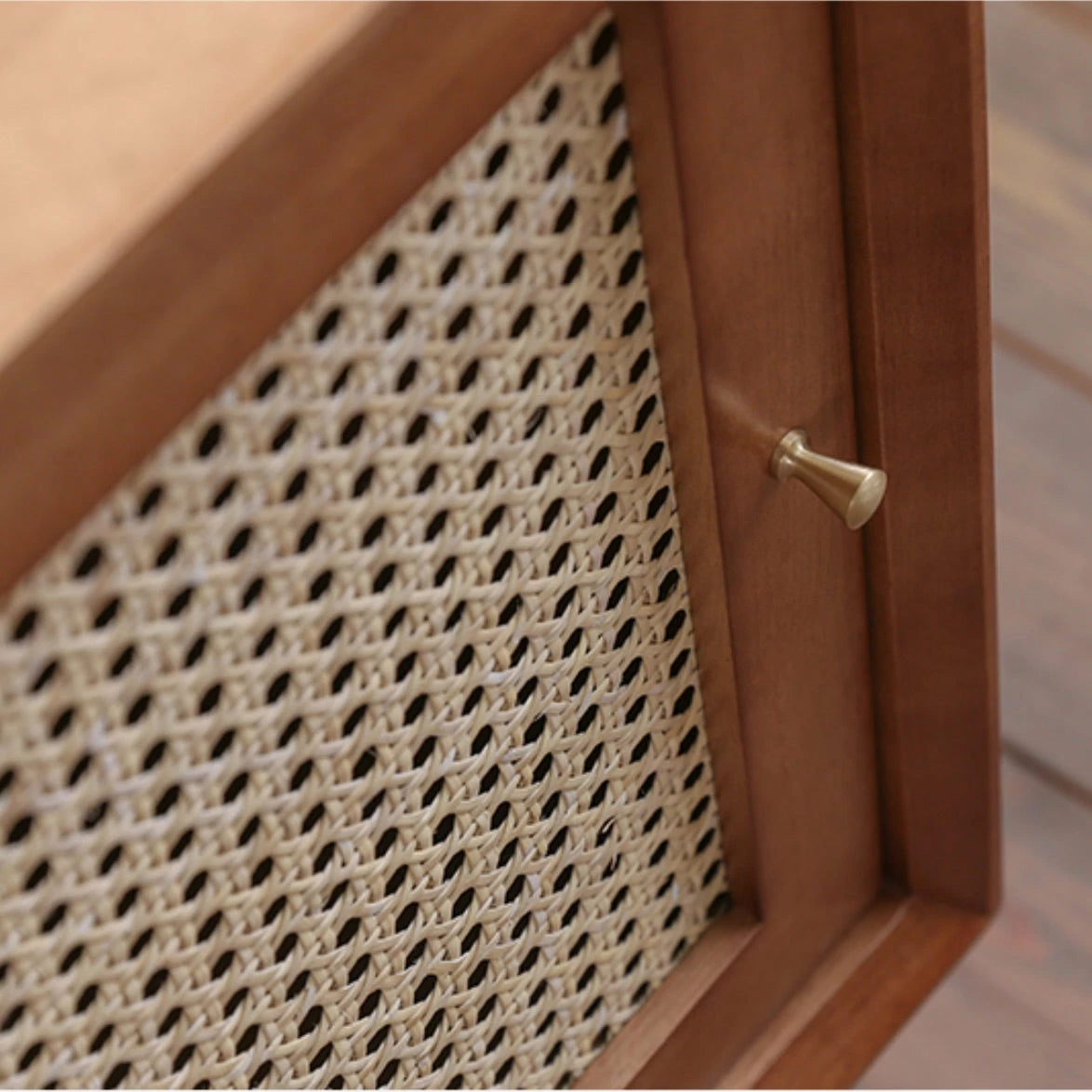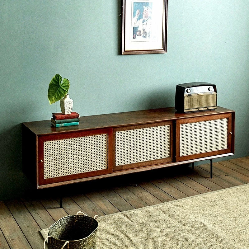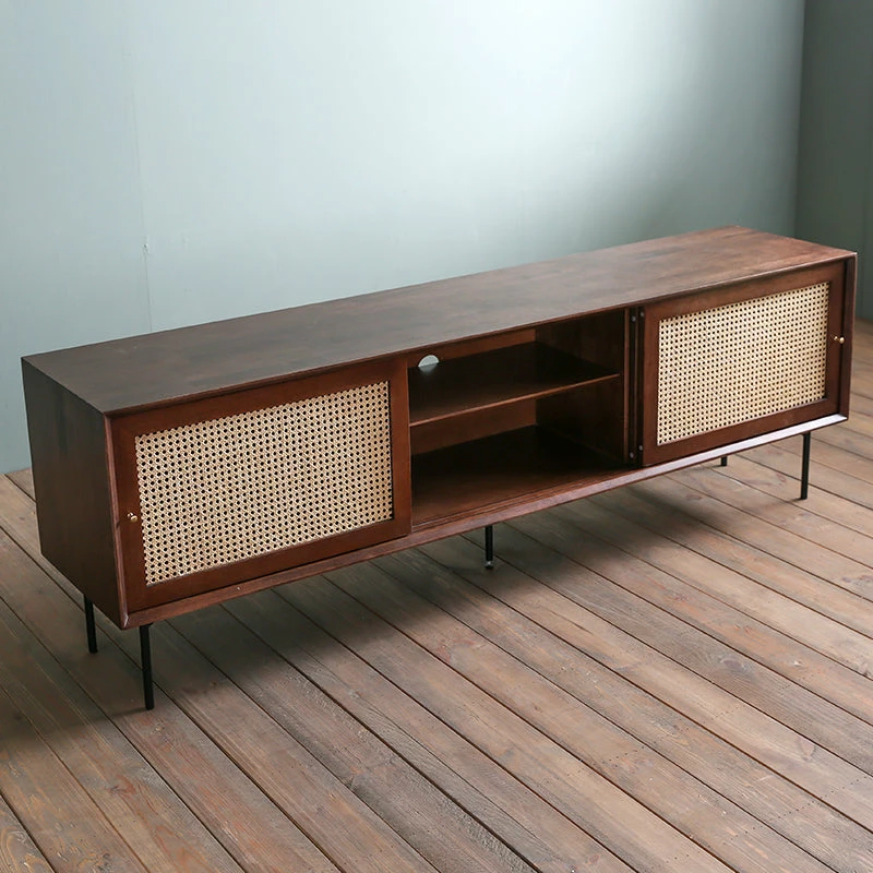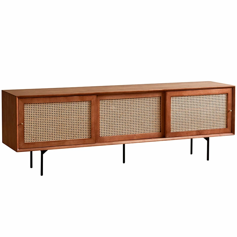 What a wicked wicker beauty! This Midcentury Modern Wood TV Cabinet has a solid wood frame enhanced by rattan mesh doors and brass fittings. It’s the perfect furniture to get when your “old” home is in need of a style update. Let this storage cabinet hold your prized vintage record player. Add pizzazz to your vintage, farmhouse, country, or minimalist home with the character of this piece. This cabinet’s retro look will be perfect in your living room, dining room, entry way or entertainment room.