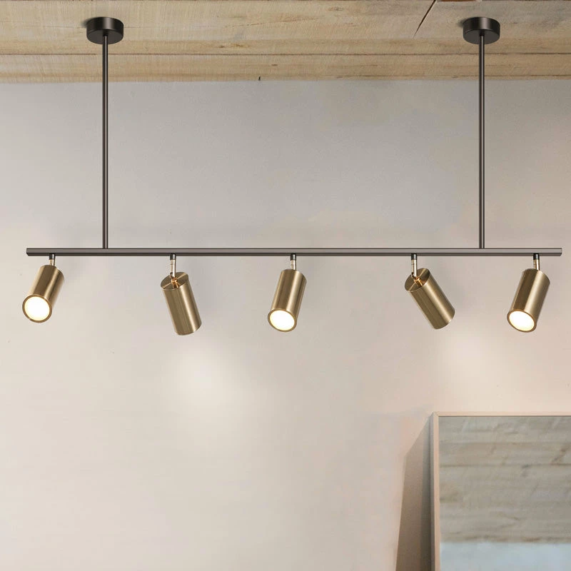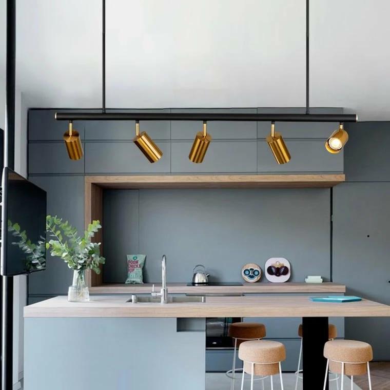This stunning island pendant light, combines clean lines with stylish elegance. A black frame and angular shapes lend modernity, while the matt brass finish of the spotlights brings an understated luxe. We see these working well above a bar area or as a crown to a beautiful long dining table.