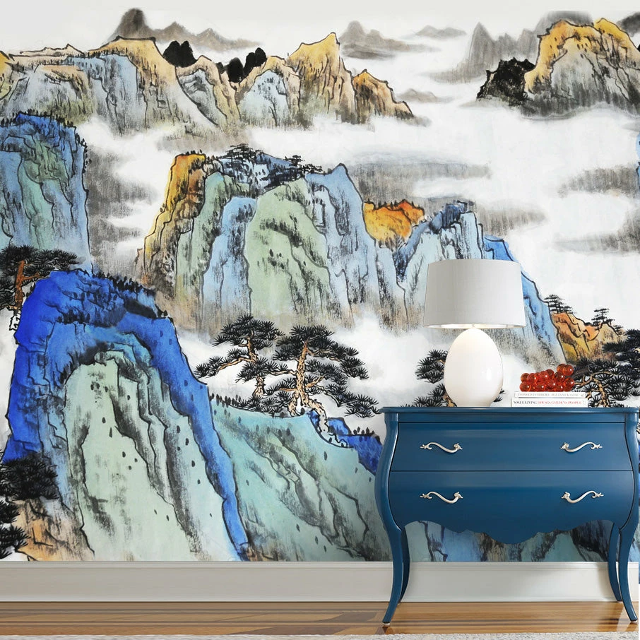 This is one of our all time favorites from the new collection. We love the modern interpretation of an oriental style art piece. The mountain scene depicted really comes to life with vibrant modern hues of blues, greens and orange. A real statement piece for the living room – virtually a whole wall art installation! We see it working well with modern oriental and eclectic style interiors. Working out how many square meters you’ll need for your space is easy – just follow the simple steps below and we’ll custom size it for you and ship it free worldwide.