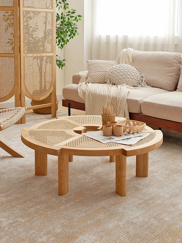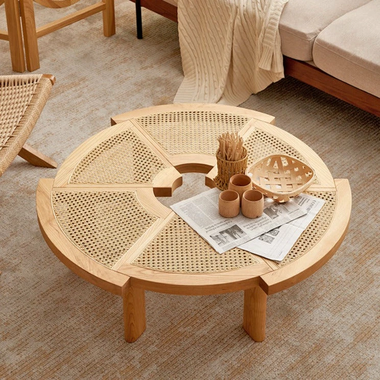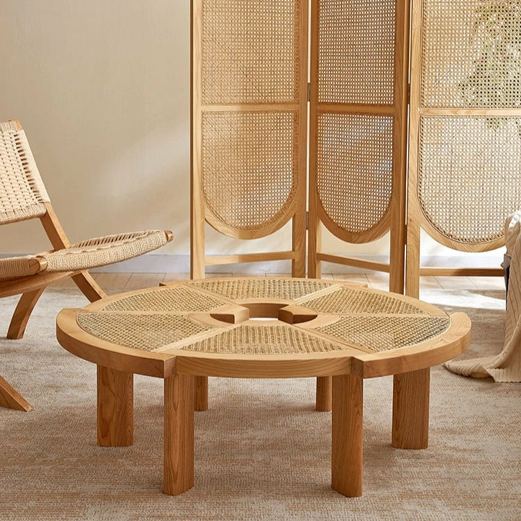 Originally designed by Charlotte Perriand, a French architect and designer, in 1962. This Replica Rio Low Table’s unusual design, combined with its functionality, elevates it to the status of a masterpiece. This round coffee table is made of solid ash wood with a transparent matt finish and a rattan cane mesh top. The six non-aligned sections that make up the table top with a hole in the centre come in three different colours – natural, walnut or black.