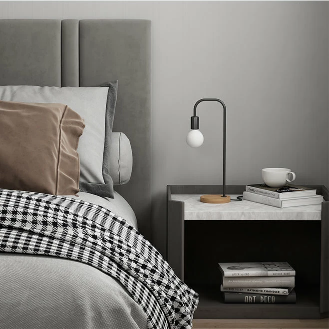 Simple and elegant, an over-size bulb gives this modern table lamp a subtle retro look. Made of powder coated steel with a solid oak wood base, it’s available in black or copper finish. Perfect for the home office or bedside table.
