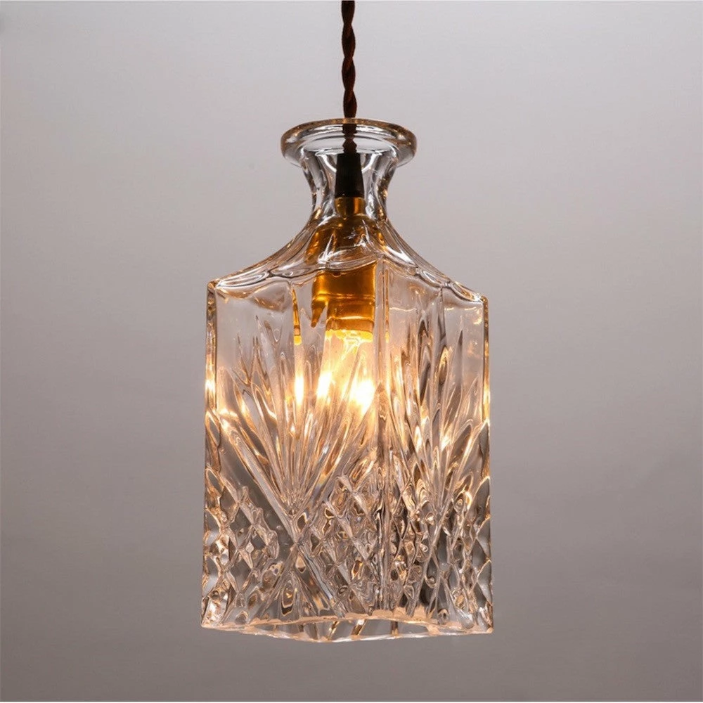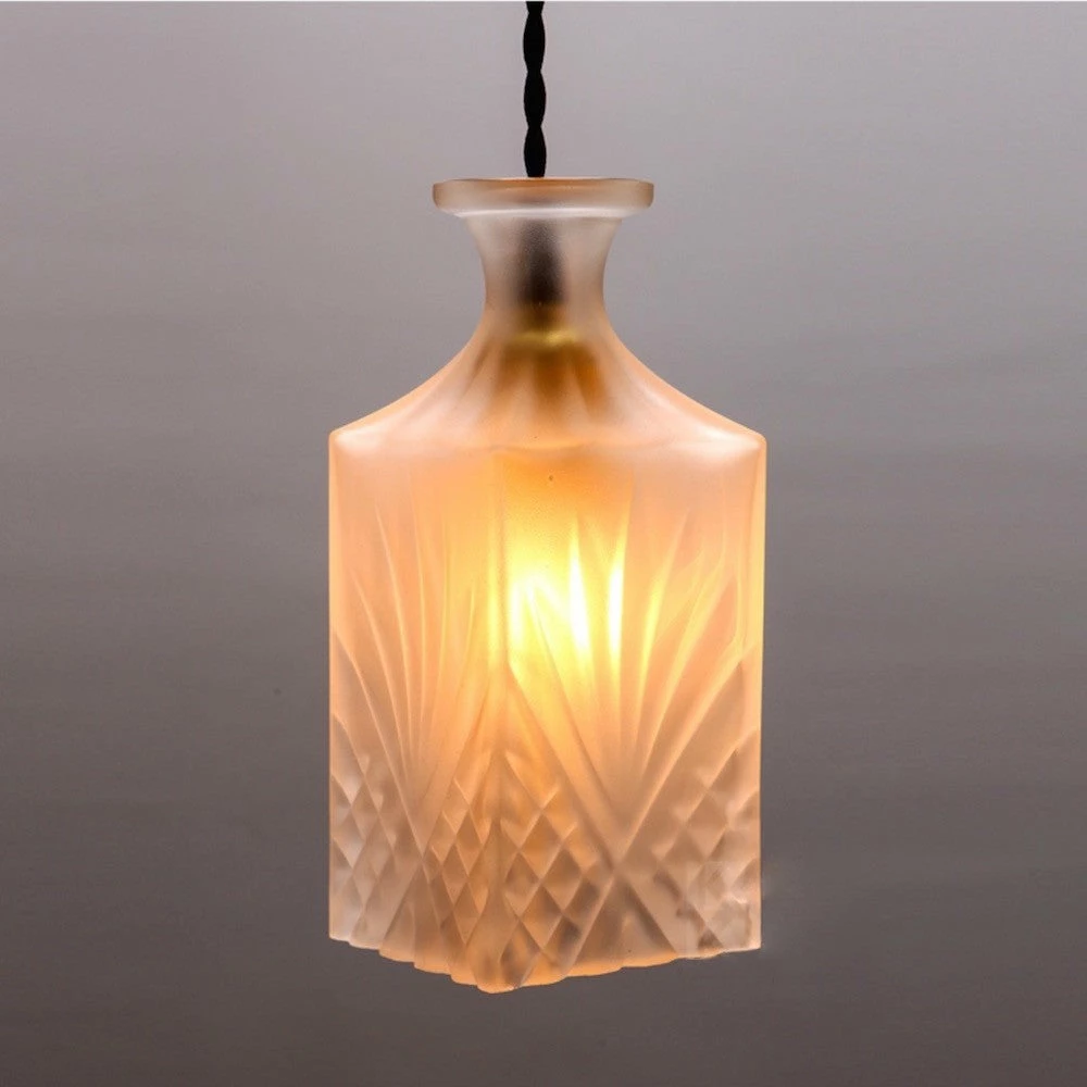 This beautiful, quirky pendant light takes the form of a vintage liquor bottle. The bottle shape, sparkle of cut class, and retro material hanging cord make a fun and elegant addition to living spaces such as an open kitchen, bar or dining area. Available in clear or frosted glass and as single pendants or a cluster of three.