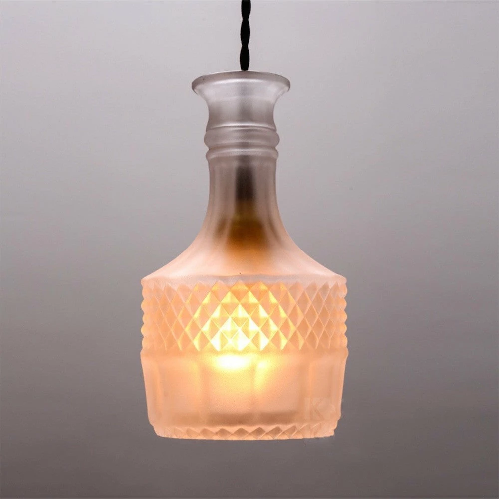 This beautiful, quirky pendant light takes the form of a vintage liquor bottle. The bottle shape, sparkle of cut class, and retro material hanging cord make a fun and elegant addition to living spaces such as an open kitchen, bar or dining area. Available in clear or frosted glass and as single pendants or a cluster of three.